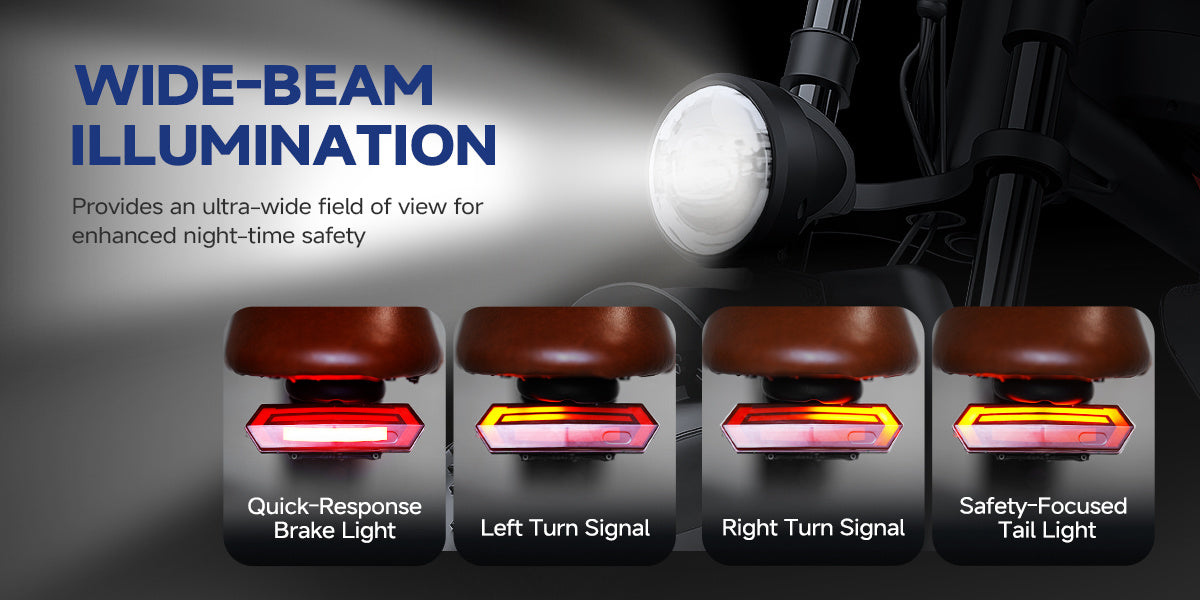 Safety & Control : Front/rear mechanical disc brakes ensure reliable stopping power. IP54 water resistance protects against splashes and dust. Includes headlight + brake taillight for enhanced visibility.